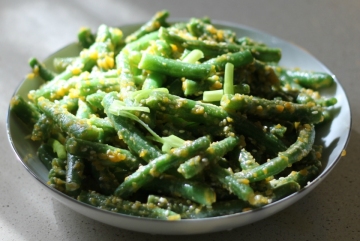 煮豆角的时候看着点儿,不要煮的太老,太老颜色不好看,口感也不好,煮好后放在凉水里稍泡下,保持绿色。