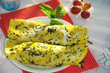 9、面糊凝固后再倒入鸡蛋液,撒上黑芝麻,煎到金黄。