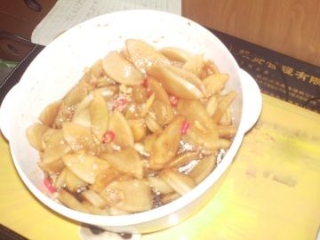 1. 白萝卜1个、白醋、细砂糖、姜、大蒜、干辣椒(忘了拍下了) 2. 干辣椒切细,姜、大蒜切碎。 3. 萝卜切薄片。加入一勺盐,用手抓一抓萝卜。这样萝卜的苦水就会挤出来一些。 4. 腌上半小时,苦水就会挤出来很多。 5. 倒掉苦水,放入姜、蒜、干辣椒。倒入白醋。(白醋最好多放点) 6. 再放一勺糖下去。 7. 搅拌均匀。 8. 装入有盖的容器里。腌上半天就能开吃了。 9. 很下稀饭或小酒的小凉菜哦