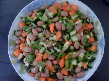 4、芹菜略焯一下切小段,胡萝卜切丁,加少许盐、香油调一下。