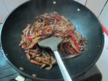 9. 茄丝开始变软,加绍酒、酱油和白糖。