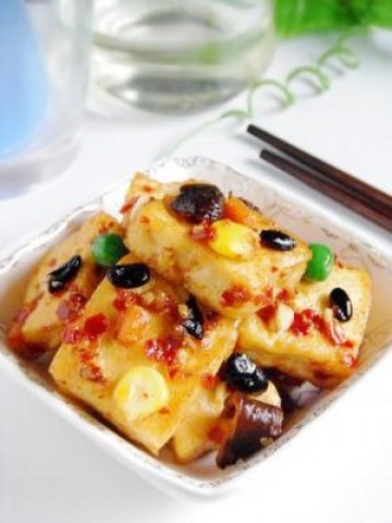 豆腐1块、香菇数朵、彩蔬丁少许(玉米、胡萝卜、青豆)、豉香辣酱2勺