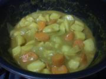5.大火烧开,转小火烧20分钟这样,土豆筷子可以穿破就可以了。不要加盐了,因为咖喱本身就有咸味的。