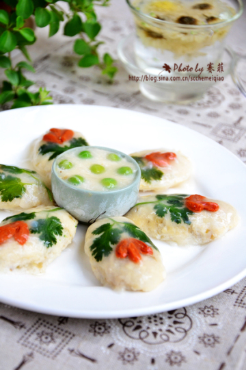 9、在豆腐泥表面铺上香菜叶,用枸杞点缀。