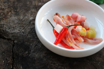 6、荤菜里通常是猪耳朵,凤爪及猪杂,先将食材煮熟,再放入泡菜坛,并且整个泡菜坛都需冷藏,温度保持在0~5度,才能保证荤菜不变质,口感也更好。