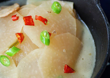 7、倒入高汤,大火烧开,小火炖至萝卜片透明。