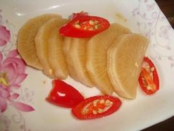 2、用酱油、大料、白糖、醋、鸡精调好汁,放入挤干的萝卜片加麻油略拌即可食用,(或腌制10分钟方便入味)