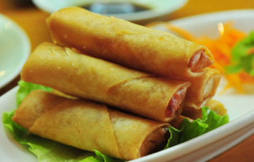 7、原炒锅置旺火上,下芝麻油(耗100克),烧至五成热,将春卷逐个下锅炸至金黄色时,捞出盛盘即成。