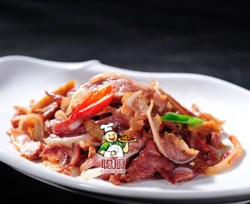 制作方法:将烤肉切成厚0.2厘米的薄片待用。锅内下入植物油,大火烧至六成热,下入烤肉片,炸至金黄色,捞出沥干油。净锅置火上加热,下入红油,倒入香脆椒煸炒至焦香,调入精盐、味精、鸡精、蚝油大火翻炒,下入熟芝麻,倒入烤肉片,淋香油,起锅装盘即可。