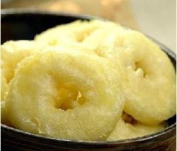 3、将苹果圈挂糊,然后沾上面包糠,下油锅炸至金黄。