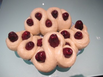 23.用手掰两个小小的红枣肉,分别摆放在如意卷的两个中心。