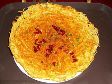 2、锅里放入300克食用油,烧至5成熟,放入土豆丝炸至金黄,捞出待用。