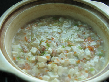 5、所有的碎末与豆腐一起放入高汤中煮开后,放盐、味精调味,放入咸蛋黄碎,勾芡,起锅。