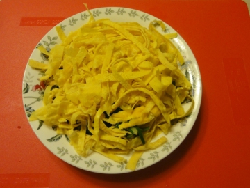 4、一张张鸡蛋皮就制作完成了。蛋皮摊薄一点较好,一般四五只鸡蛋可做五六片。