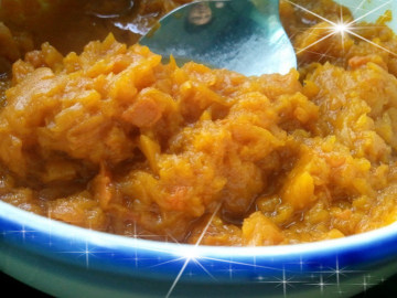 2) 開鍋20-30分之後﹐南瓜若爛糊繼續煮小豆和豌豆﹐並將南瓜取出 用勺子颳去肉。