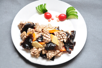 8. 将黑木耳洗净,揪成小片,连同胡萝卜和冬笋片一起炒熟。
