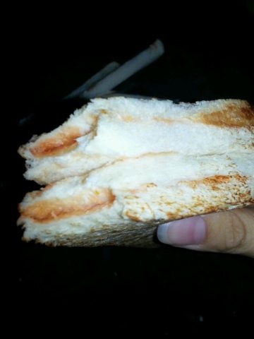2.番茄沙司挤在其中两片切好的圆形面包片上,然后用另外余下的两个圆形面包片改住,制成夹心面包
