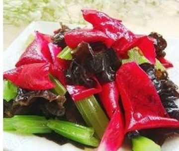 1.玫瑰花瓣用淡盐水泡10分钟并洗净、黑木耳泡发洗净撕成小瓣,芹菜洗净切段