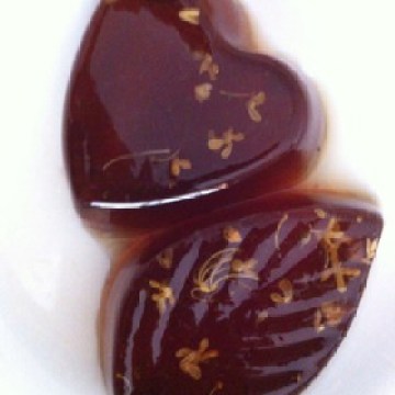 1.50ml红酒 三分之一片吉利丁片加1茶匙热水隔水加热溶化搅拌均匀后倒入红酒内搅拌均匀放入冰箱3个小时以上待其凝固。