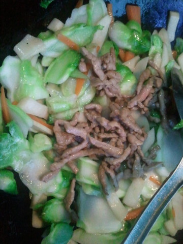 5、加少许清水,大火烧开,然后下肉丝,加两勺蚝油,继续翻炒。