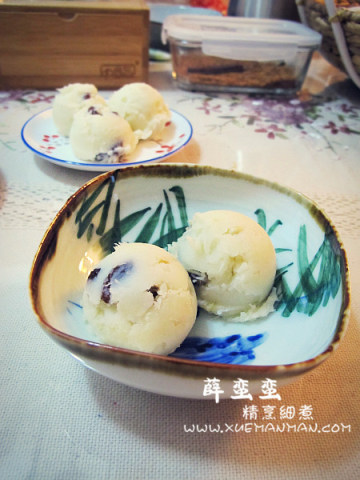 3、在山药泥中放入洗净、沥干水分的葡萄干、蜂蜜,搅拌均匀后用冰淇淋勺做球形摆盘即可。