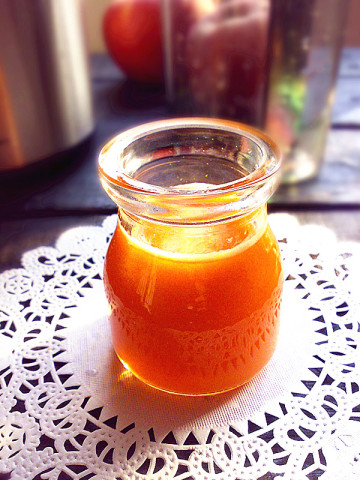 2、将果菜块分别放入搅汁机中搅汁,用净纱布滤汁,倒入碗中,加蜂蜜调和存放瓶中,饮用时倒出一部分冲水喝。
