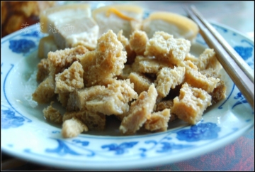 1、因为是新鲜的烤麸,买来就已经切得很小了,所以不需要怎么处理,直接下大油锅,小火炸至金黄。