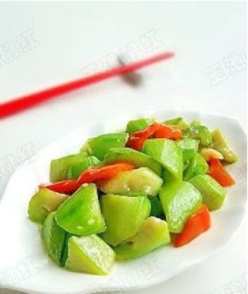 5.丝瓜熟透时放红椒块和少许盐调味,翻炒几下后加鸡精炒均匀即可