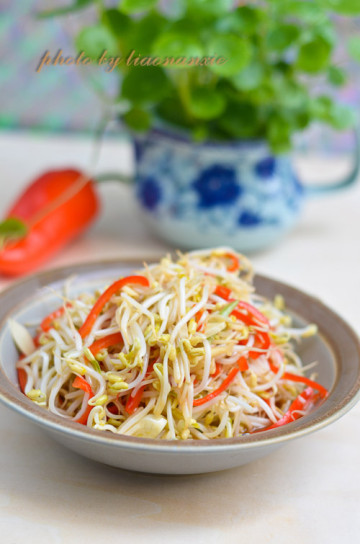 绿豆豆芽,红椒,葱,姜,盐,醋,生抽,胡椒粉,糖,烹调油