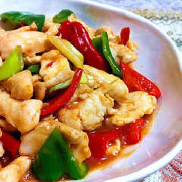 胸脯肉,青椒红椒,葱白,胡椒粉,小苏打,蚝油,番茄沙司,淀粉