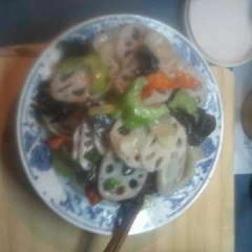 白藕150克红椒 适量百合 适量苦瓜 适量水发木耳 适量醋 适量盐 适量糖 适量