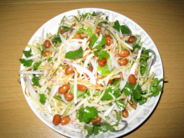 1. 把土豆切丝,也可以用茬子,我喜欢吃手切的。用水洗两边去掉淀粉,控干水分备用。 2. 锅内放小半锅油,烧热后将土豆丝放入,炸的时候不用管它,可以在这时候将香菜切段,洋葱切成细丝。等土豆丝炸到飘起来金黄色的时候捞出来。 3. 把土豆丝放盘子里凉一会 4. 把炸好的土豆丝、香菜段、洋葱丝和花生一起拌,再放一小勺盐、一小勺白醋、一点味精就ok了,味道好极了!