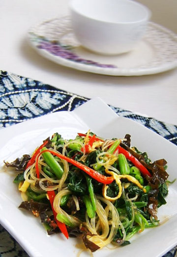 1. 将鸡蛋打入碗中,摊成象煎饼似的蛋皮,切成5公分长的丝待用。 2. 将醋、辣椒油、盐、味精、香油、蒜末依次调汁待用 3. 粉丝切成10公分长的段,放入锅中煮软待用 4. 水发木耳、红米椒也放入锅中焯熟,切丝。 5. 将菠菜摘洗干净,切成5公分长的段,在沸水中略烫,捞出马上用凉开水过凉。 6. 将调料汁倒入盛菠菜、粉丝、蛋皮、木耳、红米椒丝的碗里,拌匀后装盘即可。
