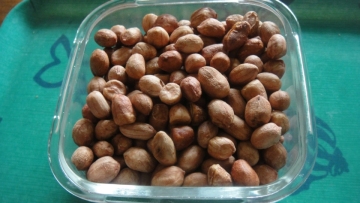 5. 泡好的花生放在平盘里,微波炉高火,若干分钟,中间用竹筷翻动,至花生米熟脆。——取决于花生米的多少和盘子的大小。