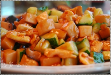1、杏鲍菇切丁,黄瓜去籽切丁。