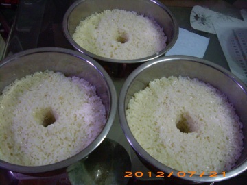 温度控制是最难的一步,慢慢摸索吧,温度低过程就慢,一天后只有洞里有水,碗底和周边水不多,尝一尝(要挖下面的)不很甜,酒味不重,饭粒较硬,就再放半天-1天,如果碗底出很多水,米饭很烂浮起来了,完全不甜,那就是过了或是温度太高了。