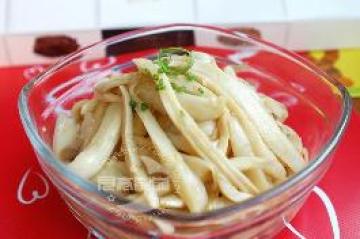 2、戴上一次性手套,把杏鲍菇撕成条状。加一点点盐、白糖、蒜末、芝麻油,撒点黑胡椒粉,放一勺海鲜酱拌匀后,撒上葱,花上桌.