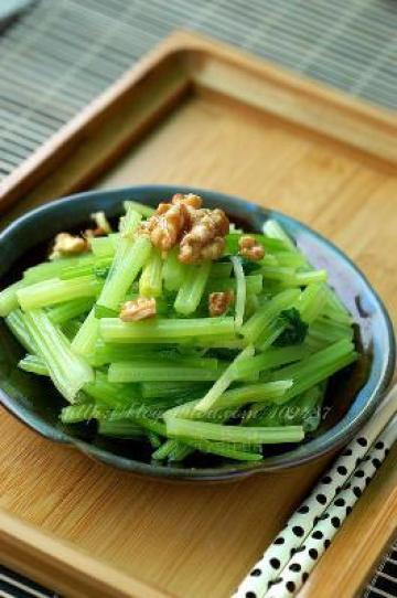 将芹菜摘去老茎和叶,洗净切丝,放沸水中焯2分钟。再用冷水冲一下,沥干水后加精盐、味精、香油入盘。将核桃仁用沸水泡软后剥去皮,再用沸水泡5分钟取出放在芹菜上,吃时拌匀。
