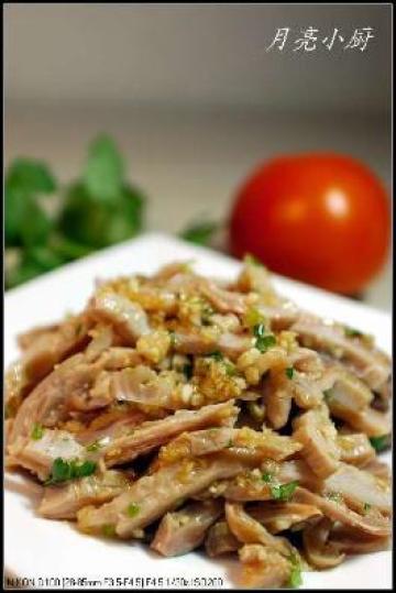 4.在肚丝上摆上蒜末,香菜碎,淋上一勺蚝油,一勺生抽,少许鸡精,再淋上麻油.上桌