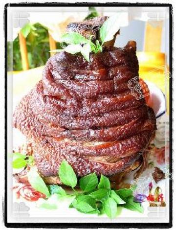 1.肘子用姜葱水焯十几分钟后取出晾干.抹一层酱油待稍干再抹一次.然后抹一层蜂蜜.晾干.