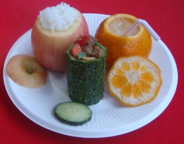 水果用掏空机掏空,装上做好的米饭,然后撒上葱花等等