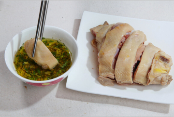 6、待要食用时,将鸡肉取出,斩成条状,或直接蘸味汁食用,或将味汁浇在鸡身食用;