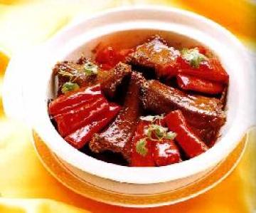 3、把红椒切成10厘米左右的段,下锅片刻后,加入煨好的蛇和原汤适当调味,然后勾芡淋上香油,出锅即成。