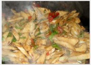 步骤5:锅中放适量油,下青红椒丝,生姜丝,红辣椒,煸炒出香味后,下入藕片翻炒。