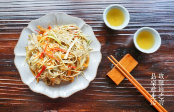 1.牛蒡洗净用刀背刮除外皮,切成细丝,以盐水加入少许白醋(调味料份量外)浸泡约一分钟让牛蒡丝变白,捞起沥干;青、红、黄椒洗净切丝去籽,备用。