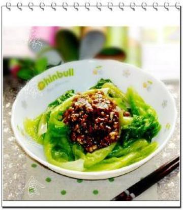 5.爆香的蒜蓉蚝油淋在沥干水分的生菜上面
