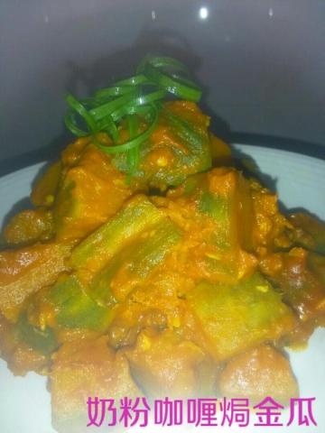 主料:金瓜700g,蒜茸1汤匙,奶粉30g,咖喱粉15g,清水250g,盐、生抽适量