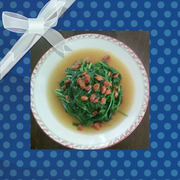 5、将枸杞子酱淋入烫好的菠菜,然后滴入香油,就是吃起来不涩滑口的菠菜枸杞子(翡翠红宝石)