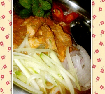 赖粉1斤,新鲜沙丁鱼1斤,辣柳叶1小把,亚叁皮8片,亚叁羔(罗望子)1汤匙,虾膏、鱼露和糖适量