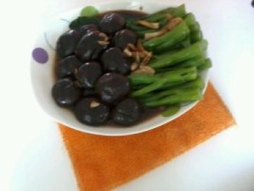 3.炒香菇,少许盐,鸡精,再加点水淀粉摆盘就好了.